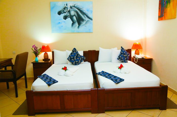 Comes with two self-contain room, interconnecting door, two beds and two washrooms. Standard Rooms Features Hot / Cold Shower, Room air-conditioning, Wi-Fi Internet Services, Satellite TV, Guest Safe Keeping & Work Desk.